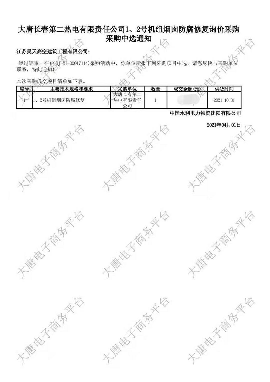 熱烈祝賀江蘇昊天高空建筑工程有限公司在大唐長春第二熱煙囪防腐修復工程招投標中脫穎而出,再次感謝大唐集團的信任和認可!